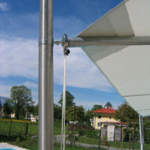 Die Segelenden/Leinen können auch auf einen zentralen Punkt umgelenkt werden. Meist laufen alle Leinen auf die Säule mit dem Rollsystem zusammen, was den Vorteil mit sich bringt, dass das Segel über einen zentralen Punkt bedient werden kann.
